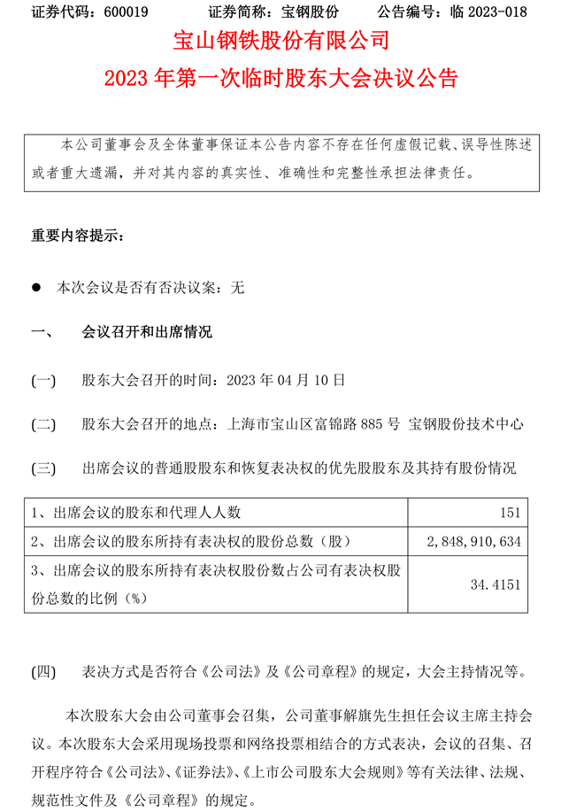 寶鋼股份:寶鋼股份2023年第一次臨時股東大會決議公告