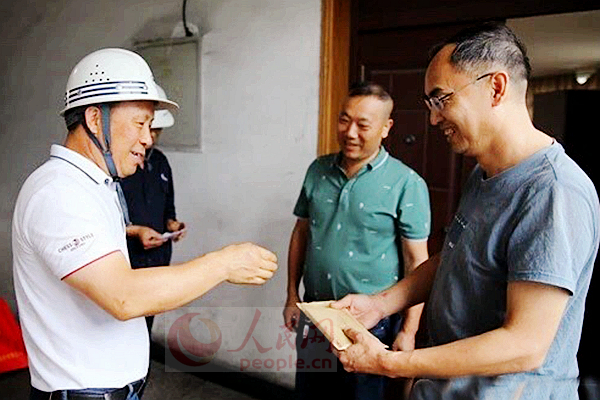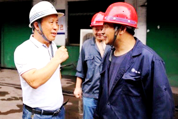 曹革新(左一)在煉鐵廠送勞動競賽獎勵。