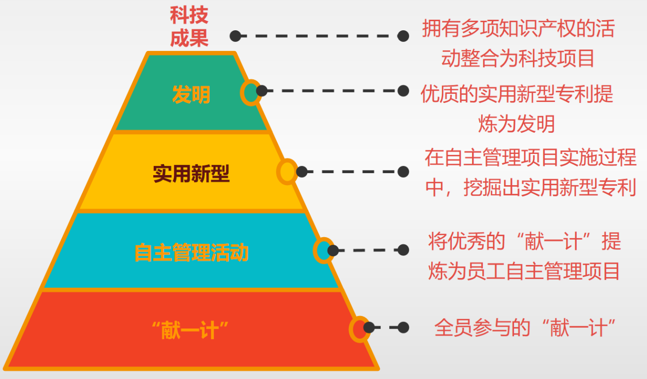 沒(méi)有制度的創(chuàng)新就如同無(wú)源之水,黨支部組織骨干認(rèn)真解析公司創(chuàng)新方面的制度辦法,形成了黨支部創(chuàng)新“金字塔”,第一層以“獻(xiàn)一計(jì)”活動(dòng)為載體,引導(dǎo)員工立足崗位積極獻(xiàn)計(jì);第二層將獻(xiàn)計(jì)轉(zhuǎn)化為員工自主管理項(xiàng)目,推進(jìn)員工獻(xiàn)計(jì)有效實(shí)施;第三層注重實(shí)施成果的提煉和挖掘,形成知識(shí)產(chǎn)權(quán);第四層將要優(yōu)質(zhì)的實(shí)用新型專利提煉為發(fā)明;最后一層將擁有多項(xiàng)知識(shí)產(chǎn)權(quán)的活動(dòng)整合為科技項(xiàng)目。