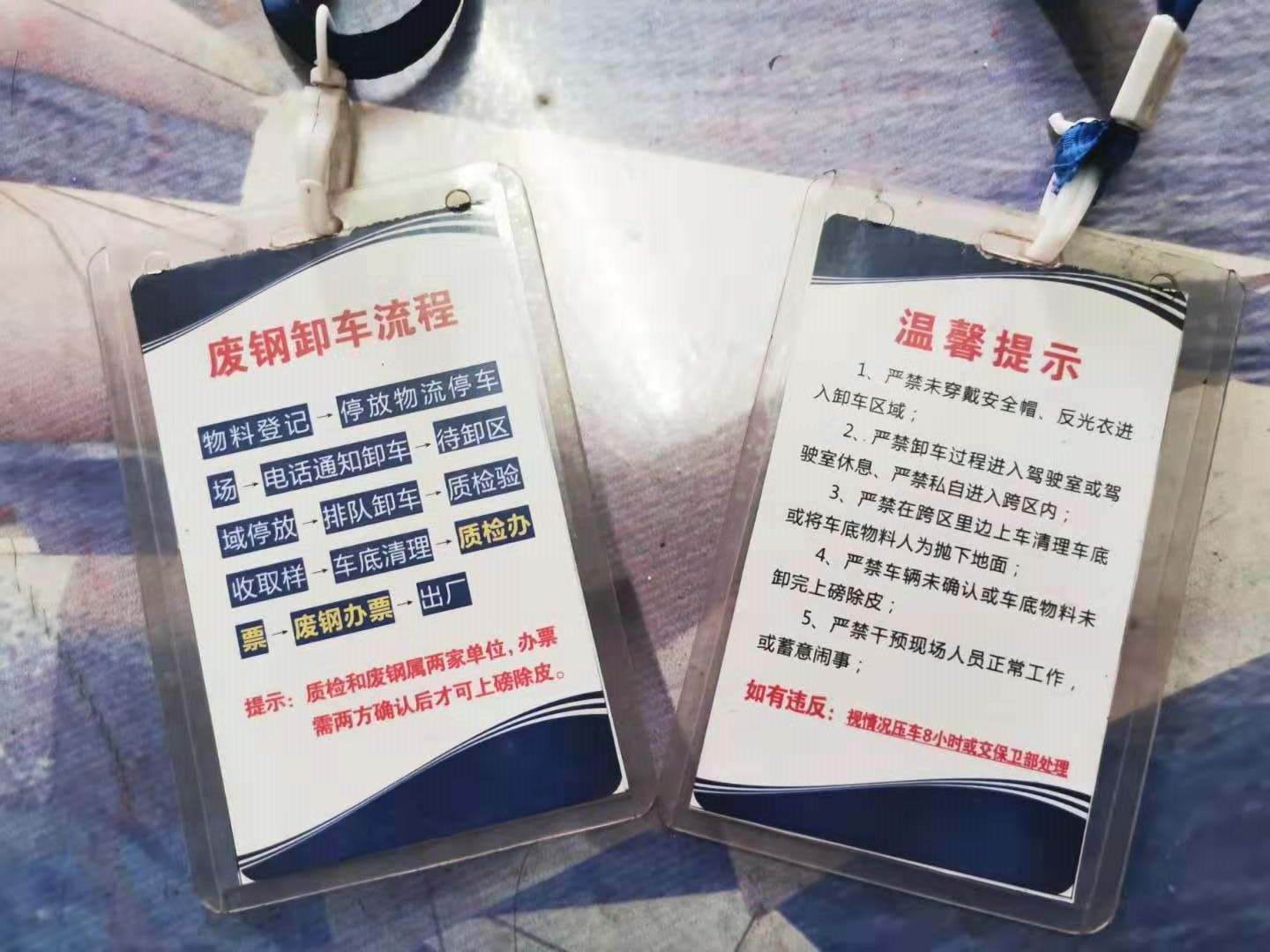 近日里,廢鋼區域進來的外來司機朋友胸前都掛上了一張小卡片,卡的正面是廢鋼卸車流程圖,能讓司機朋友很明確的了解到自己的車輛處于廢鋼卸車驗收的哪個階段;背面是現場安全提示,上面詳細的標識了廢鋼作業現場的安全風險、注意事項,提醒司機朋友進入卸車現場后如何確保自身安全。