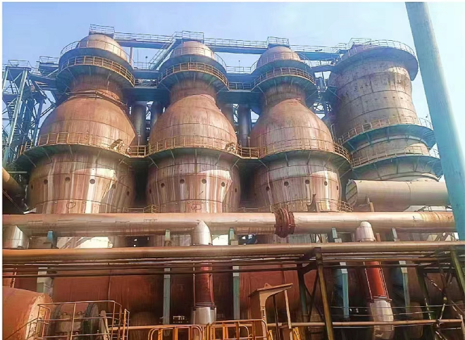 圖中右1為經(jīng)豫興公司改造后的南鋼高爐0#熱風(fēng)爐。其左側(cè)3座中的一座也正在商討請豫興公司繼續(xù)改造。