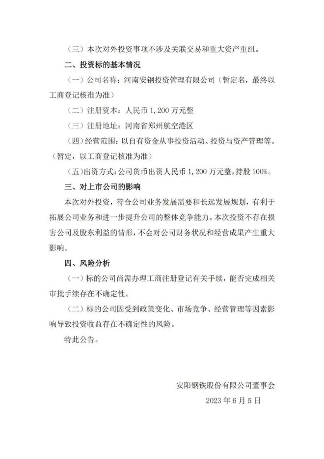 安陽鋼鐵:擬出資1200萬元設立投資管理公司