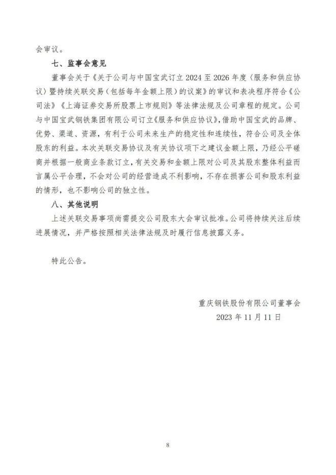 重慶鋼鐵11月10日晚間公告,為確保生產(chǎn)經(jīng)營的穩(wěn)定持續(xù)運行,重慶鋼鐵(以下簡稱公司)與中國寶武鋼鐵集團有限公司訂立《服務和供應協(xié)議》, 公司及其附屬公司提供給中國寶武及其附屬公司的物料及/或服務在2024年1月1日至2026年12月31日期間的總額不超過301億元;同期寶武集團提供給公司的物料及/或服務的總額不超過1023.30億元。