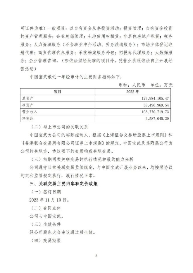 根據(jù)協(xié)議,公司向中國寶武提供的物料包括水、電、氣、鋼坯、鋼材、生鐵、固體廢棄物、鐵礦石等;服務包括加工、質(zhì)量控制及技術咨詢等技術服務等。中國寶武向公司提供的生產(chǎn)材料包括資材備件、設備、水等;原材料包括鐵礦石、廢鋼、耐材、輔料(包括白云石、石灰石等)、鋼坯、煤等;服務包括施工、軟件開發(fā)及勞務服務、汽車運輸、環(huán)衛(wèi)綠化等。雙方還約定了交易定價原則。該關聯(lián)交易對公司及其股東整體利益而言屬公平合理,并具有積極的影響。