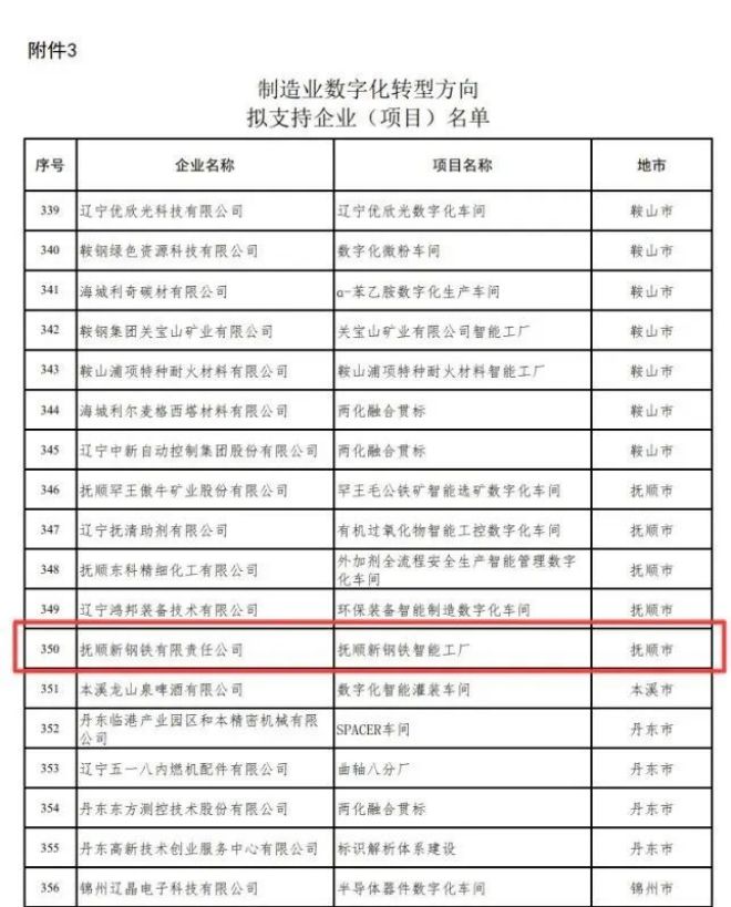 近日,由遼寧省工信廳和財政廳牽頭組織的數字遼寧智造強省專項資金(智造強省方向)申報完成結果公示,撫順新鋼鐵智能工廠項目成功入選《制造業數字化轉型方向擬支持企業(項目)名單》。這是該公司繼2022年省級鋼筋深加工數字化車間后,在智能制造和數字化轉型工作所榮獲的又一重要榮譽。