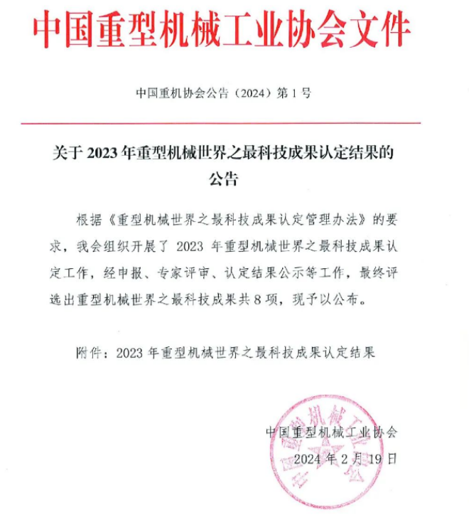 世界之最科技成果是指經(jīng)中國重型機(jī)械工業(yè)協(xié)會(huì)認(rèn)定,通過自主創(chuàng)新或協(xié)同創(chuàng)新突破關(guān)鍵技術(shù),達(dá)到或超過國際先進(jìn)水平,其中至少一項(xiàng)關(guān)鍵技術(shù)指標(biāo)在認(rèn)定之日仍保持著同類產(chǎn)品、技術(shù)世界之最的科技成果。