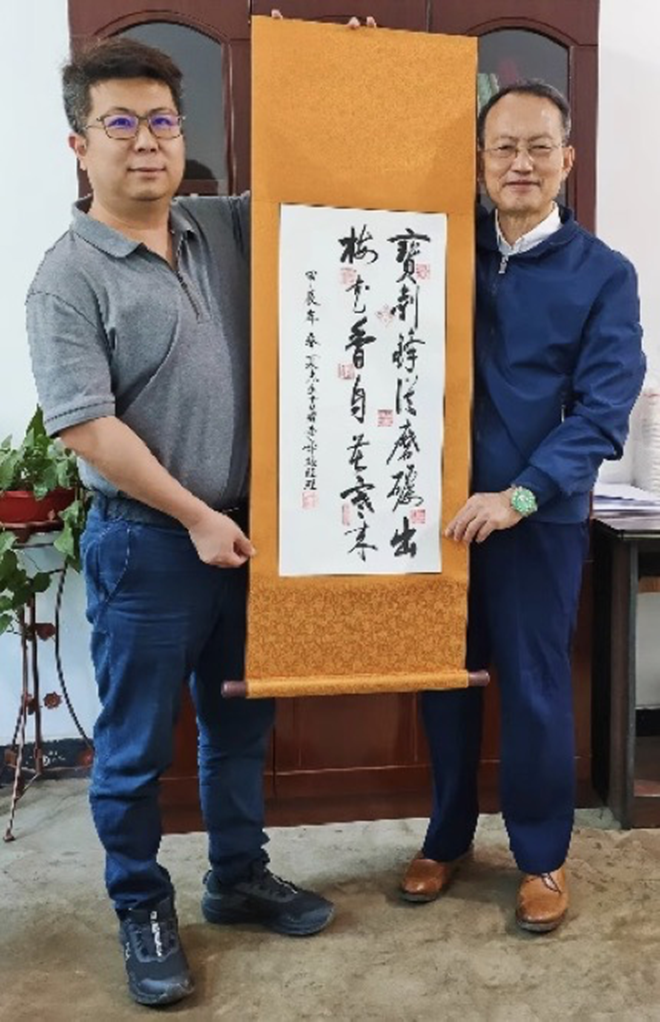 采訪結(jié)束后,記者夏杰生代表中國冶金報社向仙福鋼鐵贈送書法作品。(左)為仙福鋼鐵技改指揮部李峰經(jīng)理。(黃順秋攝影)