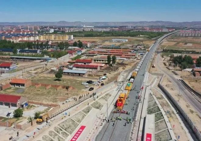 5月15日10時,烏蘭察布市豐鎮市集大原高鐵建設現場,機械設備將500米長軌、軌枕一次性鋪設到位,標志著集寧經大同至原平高速鐵路(以下簡稱“集大原高鐵”)集寧至大同段開始鋪軌。包鋼產2430噸60N U71MnH G鋼軌在整條線路上完成供貨并率先鋪設。