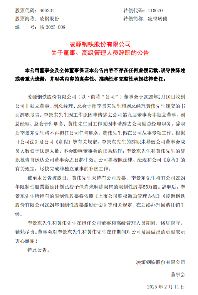 公告顯示,凌源鋼鐵股份有限公司(以下簡(jiǎn)稱“公司”)董事會(huì)于2025年2月10日收到公司非獨(dú)立董事、副總經(jīng)理、總會(huì)計(jì)師李景東先生和副總經(jīng)理黃偉先生遞交的書面辭職報(bào)告。李景東先生因工作原因申請(qǐng)辭去公司第九屆董事會(huì)非獨(dú)立董事、副總經(jīng)理、總會(huì)計(jì)師職務(wù);黃偉先生因工作原因申請(qǐng)辭去公司副總經(jīng)理職務(wù)。辭職后李景東先生將不再擔(dān)任公司任何職務(wù),黃偉先生仍在公司從事專項(xiàng)工作。