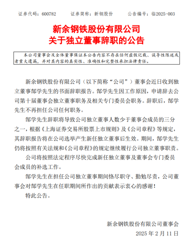 2月11日,新鋼股份發(fā)布了《新余鋼鐵股份有限公司關(guān)于獨(dú)立董事辭職的公告》。