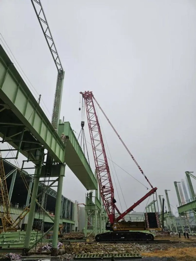 特厚板冷床、過跨平車上方大跨度吊車梁在寶鋼開創性地使用了“托架-吊車桁架”的結構形式,構件高度大幅減小,因其鏤空構造,造型美觀,整個區域的通風和采光效果俱佳,用鋼量、安裝量均有明顯減少。作為核心的3根托架-吊車桁架下弦(箱型梁)利用年修期間全部完成吊裝,其中體量最大箱梁為156噸。