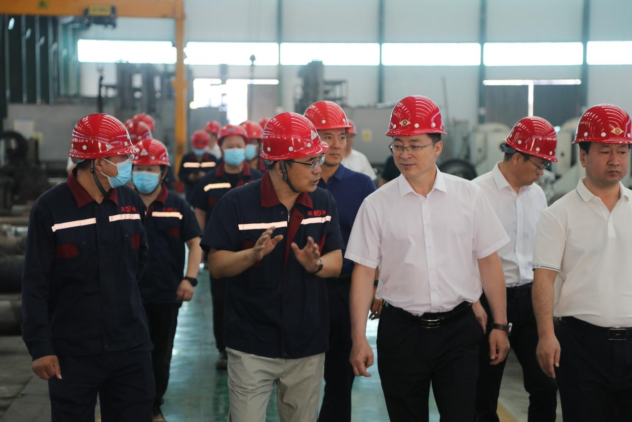 圖為朝陽聯強軋輥有限公司董事長張正(中)在孫建勛總經理(右)陪同下在公司車間調研