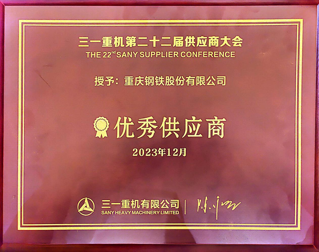 2021年,三一重機(重慶)有限公司投產,重慶鋼鐵憑借堅實的中厚板生產實力、優秀的中厚板產品質量及區位優勢,在三一重機(重慶)有限公司的供應商市場中脫穎而出,成為三一重機(重慶)基地優秀的合作伙伴。2023年12月,三一重機(重慶)有限公司在江蘇昆山召開了2023年度“三一重機第22屆供應商大會”,重慶鋼鐵憑借優秀、高質量的產品和服務,以及良好的品牌口碑和信譽,榮獲三一重機“優秀供應商”稱號。
