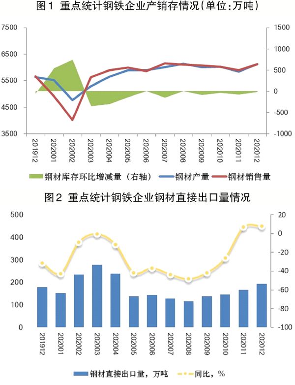 2020年1月~12月份,重點統計鋼鐵企業同2019年1月~12月份相比,國內鋼材銷售量的增幅大于鋼材產量的增幅,表明重點統計鋼鐵企業增產的鋼材在國內市場得到了消化,同時,國內市場還消化了一部分出口轉內銷的鋼材。