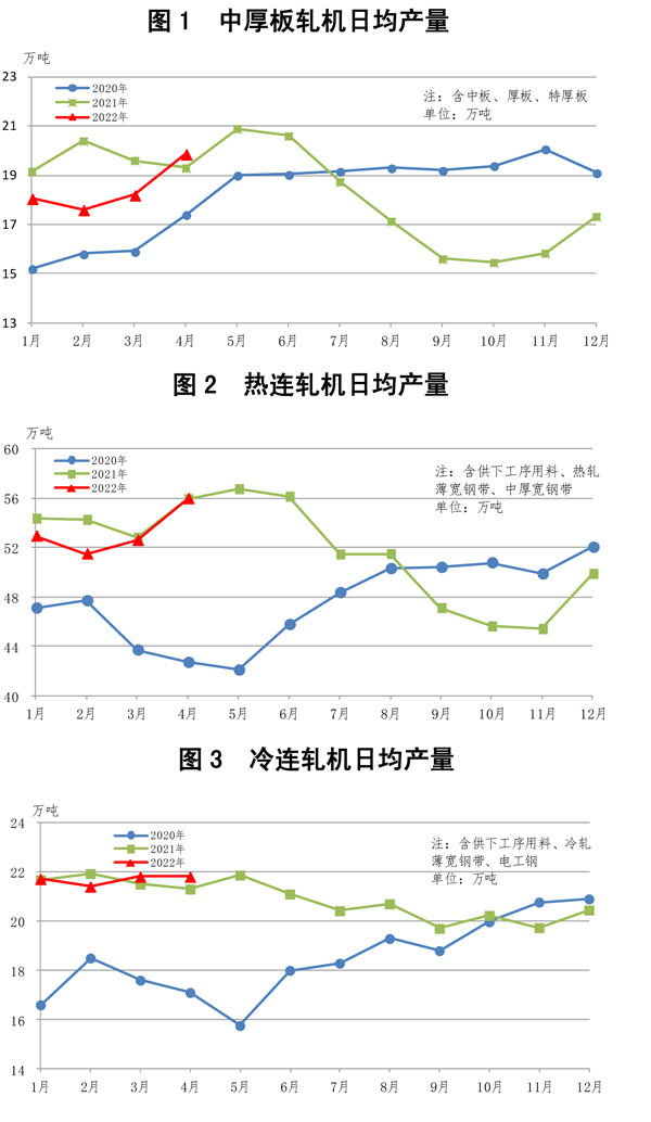 4月份,中厚板軋機生產特厚板、中厚板596萬噸,同比增加18萬噸,上升3.0%。1月-4月份累計生產特厚板、中厚板2214萬噸,同比減少100萬噸,下降4.3%。4月份,熱連軋機生產1679萬噸,同比增加1萬噸,上升0.1%。其中,商品量為964萬噸,同比減少45萬噸,下降4.5%;供下工序用料715萬噸,同比增加46萬噸,上升6.9%。1月-4月份,累計生產6423萬噸,同比減少172噸,下降2.6%。4月份,冷連軋機生產654萬噸,同比增加14萬噸,上升2.1%。其中,商品量為447萬噸,同比減少5萬噸,下降1.0%;供下工序用料207萬噸,同比增加18萬噸,上升9.7%。1月-4月份,累計生產2603萬噸,同比減少54萬噸,下降2.0%。
