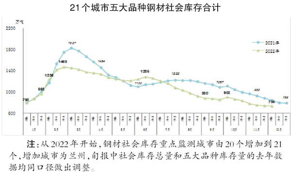 12月上旬,21個城市五大品種鋼材社會庫存為735萬噸,環(huán)比減少4萬噸,下降0.5%,庫存繼續(xù)小幅下降;比今年初減少53萬噸,下降6.7%;比去年同期減少106萬噸,下降12.6%。