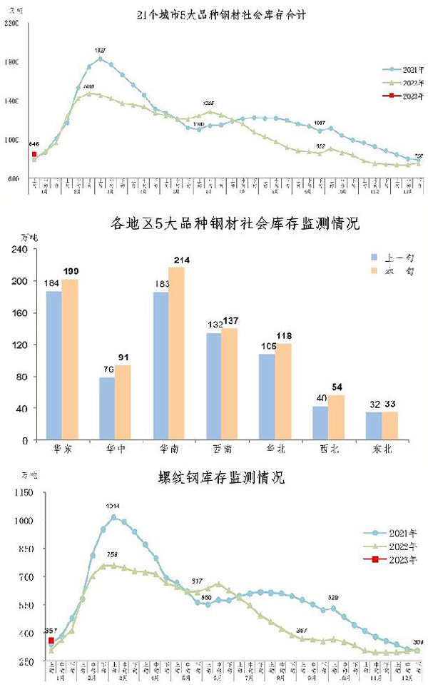 1月上旬,21個城市五大品種鋼材社會庫存為846萬噸,環比增加94萬噸,上升12.5%,庫存上升幅度擴大;比2022年同期增加53萬噸,上升6.7%。