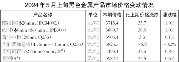 5月上旬,Φ20毫米HRB400E螺紋鋼價(jià)格為3715.4元/噸,環(huán)比上升35.7元/噸,升幅為1.0%;Φ8毫米~Φ10毫米HPB300線(xiàn)材價(jià)格為3889.7元/噸,環(huán)比上升38.9元/噸,升幅為1.0%;20毫米Q235普通中板價(jià)格為3905.1元/噸,環(huán)比上升3.3元/噸,升幅為0.1%;4.75毫米~11.5毫米Q235熱軋普通卷板價(jià)格為3825.5元/噸,環(huán)比下降6.9元/噸,降幅為0.2%;Φ219毫米×6毫米20#無(wú)縫鋼管價(jià)格為4493.1元/噸,環(huán)比下降37.5元/噸,降幅為0.8%;5#角鋼價(jià)格為3982.7元/噸,環(huán)比上升23.5元/噸,升幅為0.6%。 (郭同炬)
