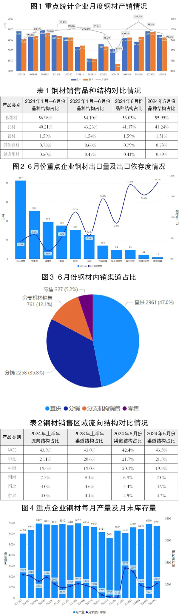 6月份,重點企業內銷鋼材量為6307萬噸,內銷占比為95.44%。其中,通過直供、分銷、分支機構銷售、零售分別占比為47%、35.8%、12.1%、5.2%。