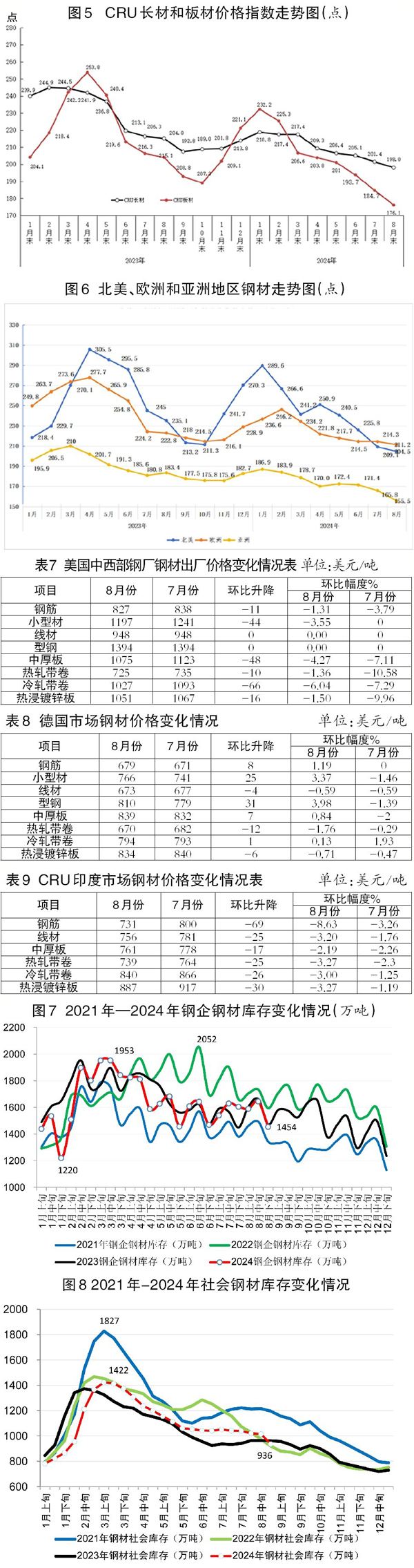 1月—8月份,CRU長材指數(shù)平均值為209.23點,同比下降23.15 點,降幅為9.96%;CRU板材指數(shù)平均值為202.93點,同比下降19.86 點,降幅為8.92%。