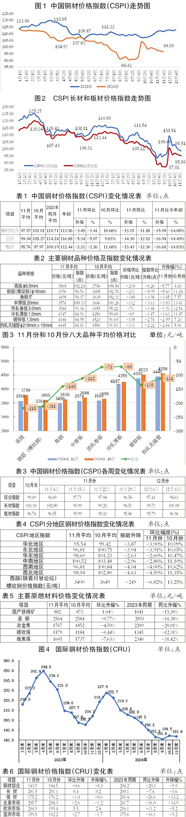 據(jù)中國(guó)鋼鐵工業(yè)協(xié)會(huì)監(jiān)測(cè),11月份,中國(guó)鋼材價(jià)格指數(shù)(CSPI)平均值為97.57點(diǎn),環(huán)比下降3.45點(diǎn)、降幅為3.41%,同比下降13.15點(diǎn)、降幅為11.88%。其中,CSPI長(zhǎng)材指數(shù)平均值為99.94點(diǎn),環(huán)比下降5.34點(diǎn)、降幅為5.07%,同比下降14.30點(diǎn)、降幅為12.52%;板材指數(shù)平均值為95.76點(diǎn),環(huán)比下降2.21點(diǎn)、降幅為2.26%,同比下降13.43點(diǎn)、降幅為12.30%。