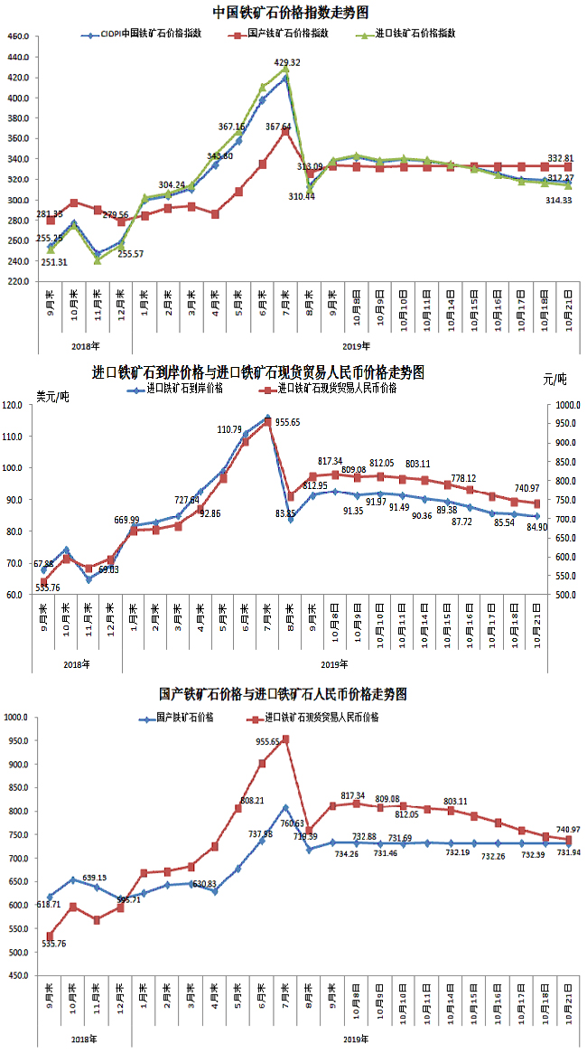 10月21日,現貨貿易進口鐵礦石62%品位干基粉礦人民幣含稅價格為740.97元/噸,環比每噸下降6.15元,降幅為0.82%,當月平均價格為786.60元/噸。