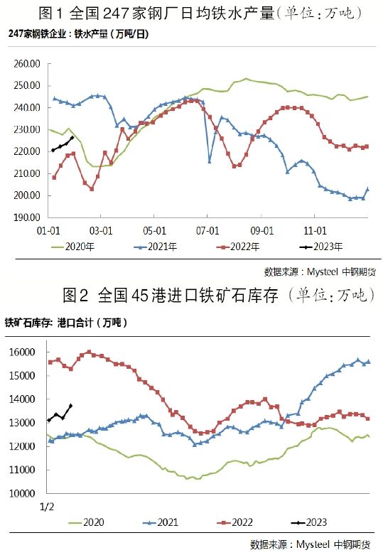在需求方面,短期受終端需求弱及鋼廠利潤(rùn)薄的影響,日均鐵水產(chǎn)量小幅回升但整體仍處于偏低水平(見圖1);春節(jié)假期鋼廠庫(kù)存消耗較多且?guī)齑骘@著低于歷史同期水平,后期存在一定的補(bǔ)庫(kù)需求。中期來看,房地產(chǎn)需求仍停留在預(yù)期層面,現(xiàn)實(shí)需求改善空間較小,鐵礦石中期需求難言樂觀。據(jù)調(diào)研,截至1月28日,全國(guó)247家鋼廠盈利面為32.47%,環(huán)比增長(zhǎng)5.20%,同比減小50.65%;日均鐵水產(chǎn)量為226.57萬噸,環(huán)比增加2.83萬噸,同比增加7.22萬噸。