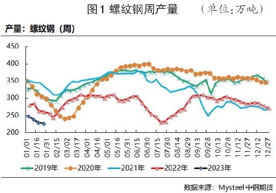 此外,自2022年下半年以來,國內大部分鋼廠利潤低或處于虧損狀態,疊加今年1月份的春節假期,致使建筑鋼材產量處于偏低水平。數據顯示,1月21日—27日,螺紋鋼周產量為227.23萬噸,同比下降33.45萬噸(見圖1);熱軋卷板周產量為305.59萬噸,同比下降16.96萬噸。兩者周產量均為近5年同期的最低水平。低供應也是利多鋼材價格的因素之一。