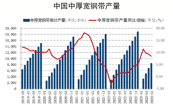 第二季度,由于需求不及預(yù)期,鋼材生產(chǎn)利潤處于低位,但在不同品種間有所分化。根據(jù)筆者的計算,螺紋鋼處于虧損狀態(tài),熱軋卷板微盈利。由于部分鋼廠可以根據(jù)不同鋼種之間的利潤調(diào)整產(chǎn)量,產(chǎn)量也有所分化。國家統(tǒng)計局最新數(shù)據(jù)顯示,5月份,全國鋼筋產(chǎn)量為1992.9萬噸,同比下降8.8%;中厚寬鋼帶產(chǎn)量為1787.8萬噸,同比增長5.6%。1月—5月份,全國鋼筋累計產(chǎn)量為9693.7萬噸,同比下降0.9%;中厚寬鋼帶累計產(chǎn)量為8342.7萬噸,同比增長8.4%。熱軋卷板期貨標(biāo)準(zhǔn)為部分中厚寬鋼帶,螺紋鋼期貨標(biāo)準(zhǔn)為部分鋼筋。