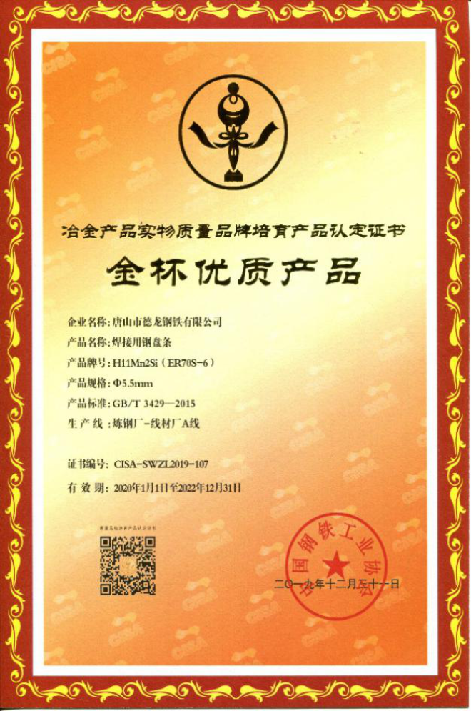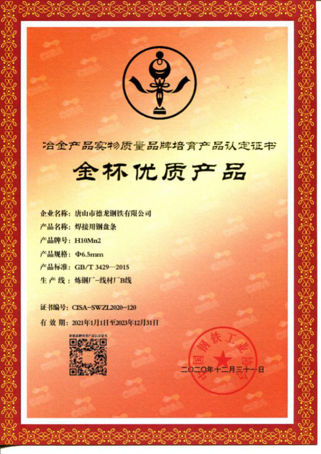 現(xiàn)在,唐山德龍已經(jīng)獲專利授權(quán)78項,其中發(fā)明專利24項,實用新型專利54項;擁有省、市、國家優(yōu)秀質(zhì)量管理成果60余項,市級優(yōu)秀技術(shù)創(chuàng)新成果一等獎2項、二等獎2項、三等獎3項,省工信廳認定新產(chǎn)品2項,省重點研發(fā)項目1項,省冶金科學(xué)技術(shù)二等獎2項、三等獎4項,卓越產(chǎn)品認證2項,金杯產(chǎn)品認證4項(H08A、H08E、H10Mn2、ER70S-6)。多項技術(shù)達到國際先進、國內(nèi)領(lǐng)先水平。公司被評為國家高新技術(shù)企業(yè)、河北省技術(shù)創(chuàng)新示范企業(yè)、河北省創(chuàng)新引領(lǐng)型領(lǐng)軍企業(yè)。