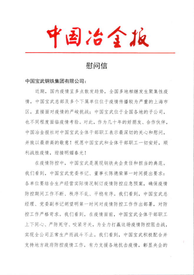 近期,國內疫情呈多點散發趨勢,全國多地相繼發生聚集性疫情,中國寶武總部及多個下屬單位位于疫情傳播較為嚴重的上海市區,直接面對疫情的嚴峻挑戰;中國寶武位于全國各地的子公司,也不同程度面臨疫情考驗。對此,作為幾十年的好朋友、合作伙伴,中國冶金報社向中國寶武發去慰問信,對中國寶武全體干部職工表示最深切的關心和慰問,并致以最崇高的敬意。祝愿中國寶武和全體干部職工一切安好,順利戰勝疫情,迎接明媚春光。