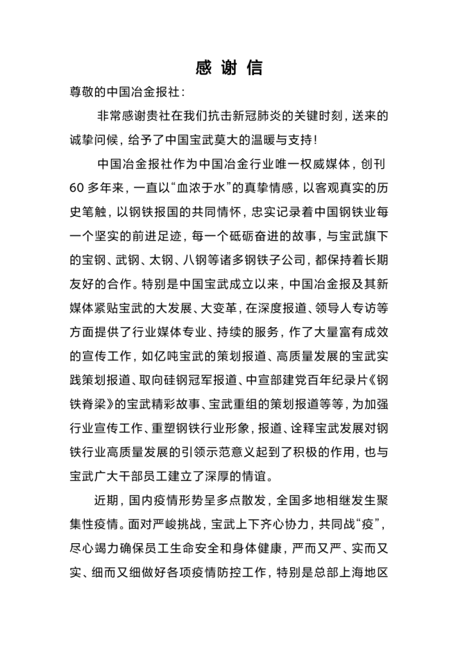 為此,中國寶武發來感謝信,表示在抗擊新冠肺炎的關鍵時刻,中國冶金報社送來的誠摯問候,給予了中國寶武莫大的溫暖與支持。一直以來,中國冶金報及其新媒體緊貼寶武的大發展、大變革,在深度報道、領導人專訪等方面提供了行業媒體專業、持續的服務,作了大量富有成效的宣傳工作,為加強行業宣傳工作、重塑鋼鐵行業形象,報道、詮釋寶武發展對鋼鐵行業高質量發展的引領示范意義起到了積極的作用,也與寶武廣大干部員工建立了深厚的情誼。中國寶武期待未來與中國冶金報社進一步加強交流與合作,共同開創中國鋼鐵業更加美好的明天!