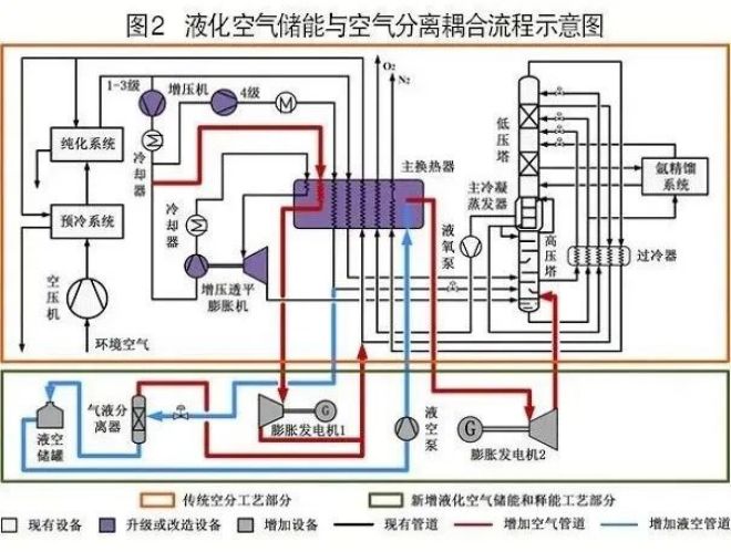 鋼鐵企業具備液化空氣儲能所需的空分裝置,通過液化空氣儲能與空分設備有機耦合,可以最大化節約設備投資成本,提高儲能經濟效益。此外,鋼鐵企業有大量低品位余熱,也可以與液化空氣儲能實現多能互補,提高儲能的綜合效率。圖2為液化空氣儲能與空氣分離耦合流程示意圖。