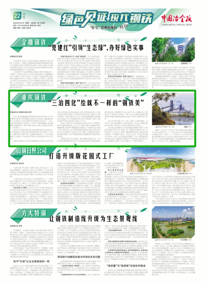 隨著“三治四化”工作深入開展,2022年重慶鋼鐵獲評為“重慶市級綠色工廠”。目前,該公司正在籌備創建國家3A級旅游景區。每年“三二八”榮譽日、“6·5”世界環境日,重慶鋼鐵都會舉行文化活動,邀請當地居民及員工家屬走進廠區,親身感受鋼城的綠意,讓重慶鋼鐵綠色發展理念深植于廣大干部員工內心,塑造綠色重鋼。