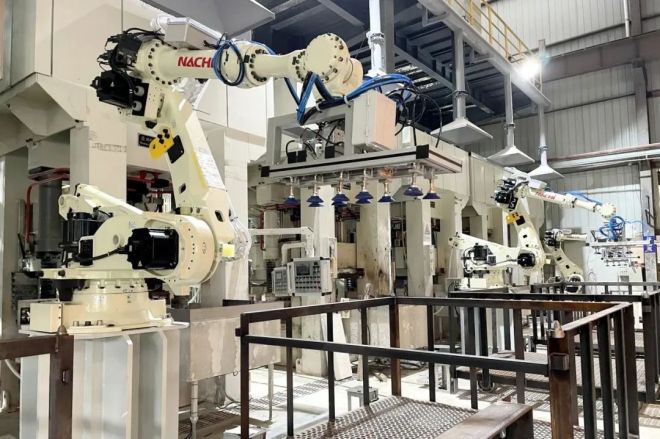 圖為硅酸鈣保溫材料生產(chǎn)的壓制工序,采用智能化機(jī)器人輔助作業(yè)