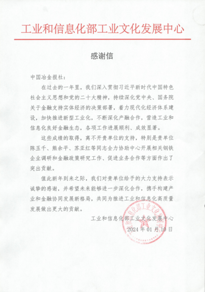 工信部工業(yè)文化發(fā)展中心、鞍鋼集團(tuán)、包鋼集團(tuán)向中國冶金報(bào)社發(fā)來感謝信