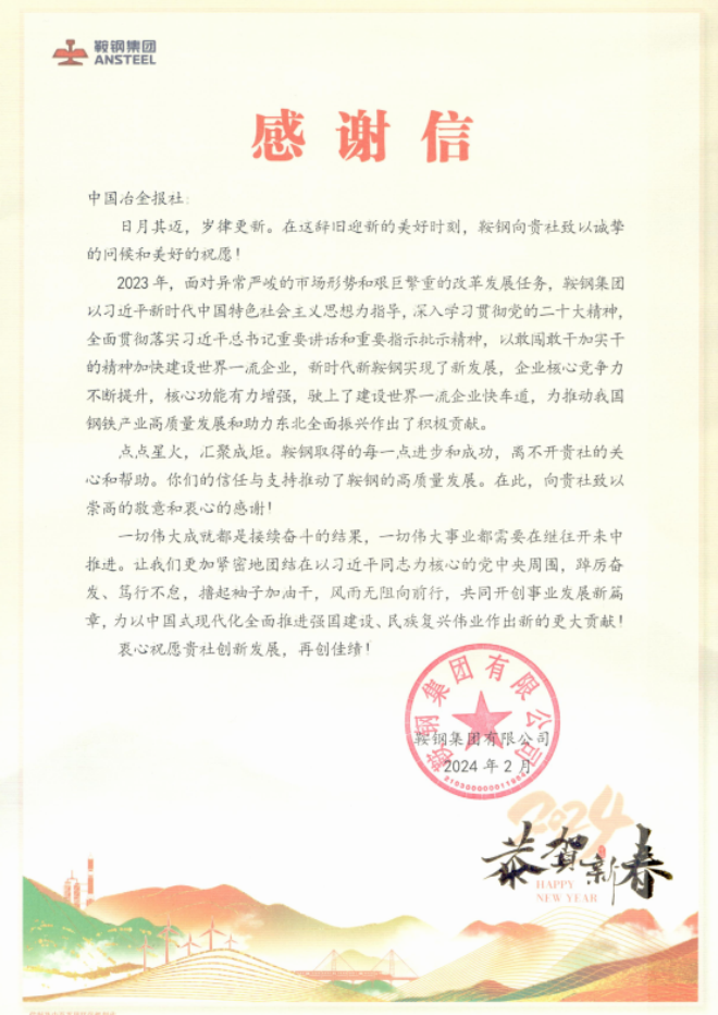 近日,工信部工業(yè)文化發(fā)展中心、鞍鋼集團(tuán)、包鋼集團(tuán)向中國冶金報(bào)社發(fā)來感謝信——