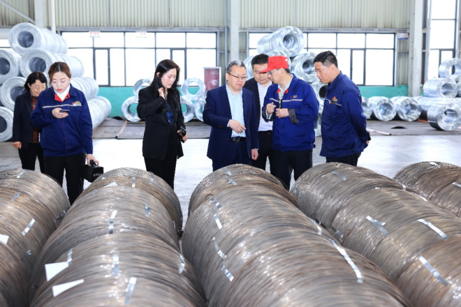 4月16日,中國鋼鐵工業協會副秘書長,中國冶金報社黨委書記、社長范鐵軍一行5人到山西晉南鋼鐵集團有限公司(以下簡稱晉南鋼鐵)與晉南鋼鐵總裁張天福以及晉南鋼鐵采購銷售等相關部門領導進行交流座談,并參觀了晉南鋼鐵金屬制品板塊及光伏產業、綜合能源島等板塊。