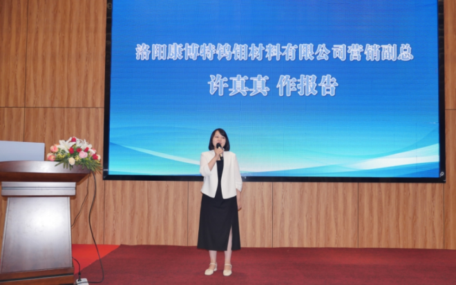 圖為洛陽康博特鎢鉬材料有限公司營銷副總經理 許真真做報告