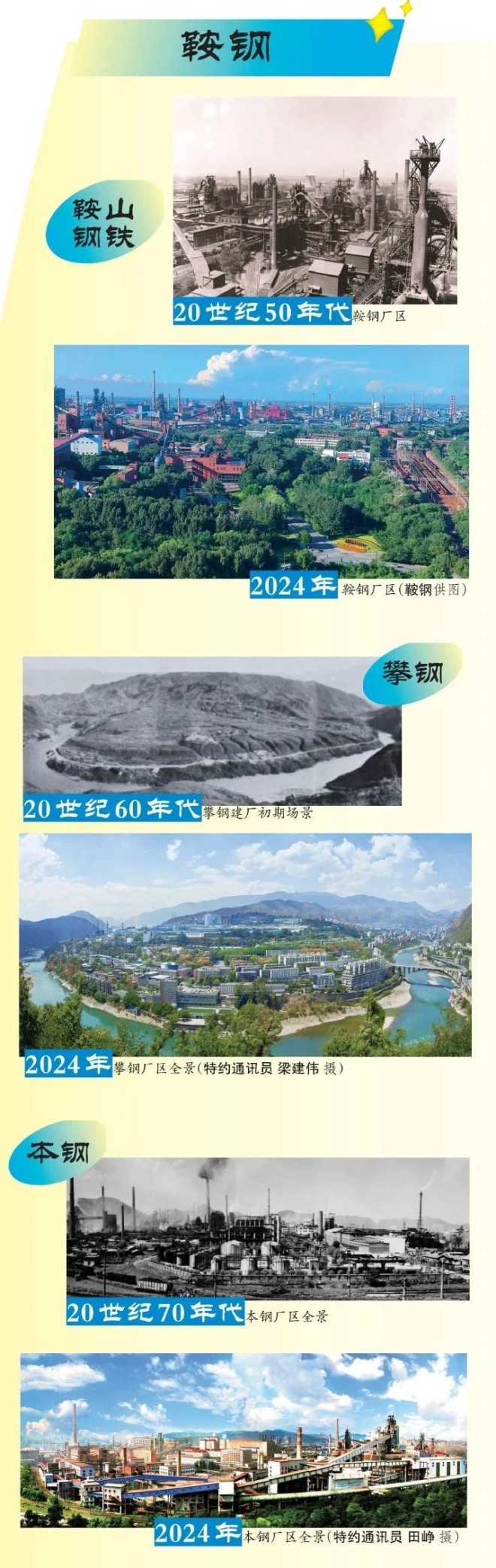 75載斗轉星移,75載滄海桑田。 為慶祝新中國成立75周年,中國冶金報社以《老鋼廠新時代》為題,展示全國鋼鐵企業(yè)廠區(qū)新老面貌對比圖片(因篇幅有限,精選部分鋼鐵企業(yè),排名不分先后),讓我們一道回望崢嶸歲月,珍惜既有成績,汲取奮進力量,在新時代、新征程上為新中國鋼鐵工業(yè)高質量發(fā)展貢獻力量!
