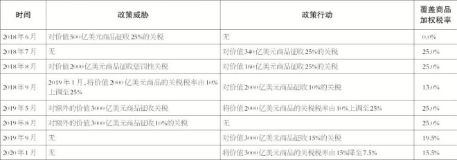公開資料顯示,特朗普在首個總統任期對華關稅政策的主要進程如下:2017年4月—2018年3月,美國貿易代表辦公室(USTR)先后通過2017年度“特別301報告”將中國納入“優先觀察清單”、對中國發起“301調查”、發布調查報告認定中國貿易政策“不公平”,為特朗普出臺對華打壓性貿易措施提供依據并構建法律基礎。2018年6月—2019年12月,特朗普政府對華施加了威脅與行動并存的大范圍關稅政策。其中,主要行動有5輪,對中國共計5500億美元的商品征收了關稅(如表)。
