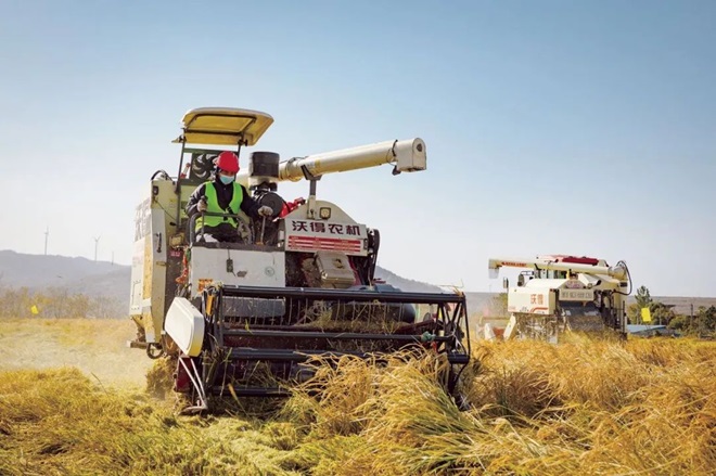 周邊村莊種糧能手正駕駛農用收割機開鐮收割。 (冷天馳 攝)