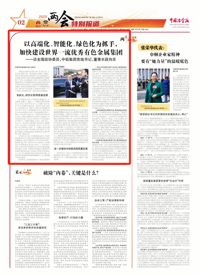 “制造業(yè)是國民經(jīng)濟(jì)的主體,是立國之本、興國之器、強(qiáng)國之基。推動(dòng)制造業(yè)高端化、智能化、綠色化發(fā)展是我們實(shí)現(xiàn)新型工業(yè)化的重要途徑,也是推動(dòng)我國從制造大國向制造強(qiáng)國躍升的重要抓手。”近日,在全國政協(xié)十四屆三次會(huì)議期間,全國政協(xié)委員,中鋁集團(tuán)黨組書記、董事長段向東向《中國冶金報(bào)》記者表示,在加快推動(dòng)制造高端化、智能化、綠色化發(fā)展的新征程中,中鋁集團(tuán)將緊密結(jié)合“新中鋁”目標(biāo)舉措,系統(tǒng)謀劃好集團(tuán)“十五五”規(guī)劃,加快建設(shè)世界一流優(yōu)秀有色金屬集團(tuán)。