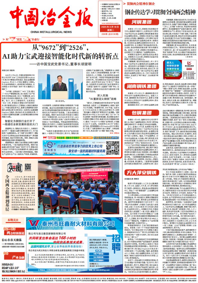“30年前,寶鋼啟動了‘9672’工程,建設了一體化產銷管理系統,極大提高了生產效率和市場響應速度,優化了資源配置,成為信息化階段的發展轉折點,引領了行業發展。如今,在人工智能時代,寶武推出‘2526’工程,希望成為智能化時代的轉折點,再次彰顯寶武在人工智能定義鋼鐵方面的決心。”中國寶武黨委書記、董事長胡望明接受《中國冶金報》記者采訪時表示,寶武將以全面部署DeepSeek為起點,推動全體系主動擁抱變革,不僅在技術層面推進創新,還在管理層面推動深刻的鏈式變革。
