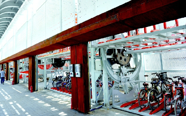 垂直循環(huán)型立體停車庫(kù)是一種新型的自行車存儲(chǔ)設(shè)施,采取轎廂式設(shè)計(jì),將自行車進(jìn)行單位化,更方便自行車的調(diào)配和安置,內(nèi)部采用類似摩天輪的運(yùn)作模式,車庫(kù)具有占地面積小、利用率高、運(yùn)行穩(wěn)定、維護(hù)簡(jiǎn)單、存取方便安全等特點(diǎn),共提供650個(gè)停車位。為最大程度方便市民使用,操作模式采用“傻瓜式”操作,可通過二維碼實(shí)現(xiàn)自動(dòng)存取車。同時(shí)車庫(kù)配備紅外檢測(cè)、聲控報(bào)警、遠(yuǎn)程監(jiān)控等安全系統(tǒng),防止人、物在設(shè)備運(yùn)行時(shí)進(jìn)入工作區(qū)域。