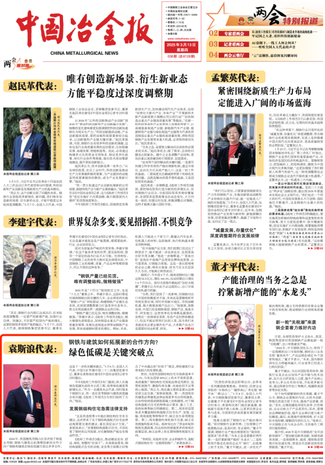 2024年,我國建筑用鋼占比首次低于制造業(yè)用鋼,鋼鐵與建筑應(yīng)拓展哪些新的合作方向?“鋼鐵和建筑在綠色低碳方面應(yīng)多多合作,這是下一步的關(guān)鍵突破點。”3月6日,全國人大代表,中國五礦所屬中國二十二冶集團黨委書記、董事長袁斯浪在接受《中國冶金報》記者專訪時提出。