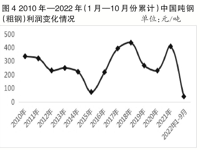 從噸鋼利潤上看,根據國家統計局公布的1月—10月份我國累計粗鋼產量86057萬噸計算,我國鋼鐵行業當期累計噸鋼利潤已經下降至34元/噸(見圖4)。