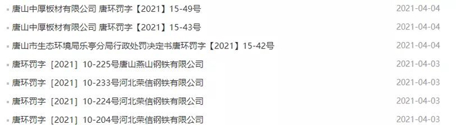 其中唐山中厚板有限公司共計收到罰單11張,處罰金額累計587萬元;唐山金馬鋼鐵集團有限公司、唐山中厚板材有限公司、唐山松汀鋼鐵有限公司等企業因在線監測造假被吊銷排污許可證、責令停業。