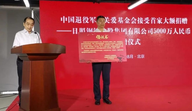 8月6日上午,退役軍人事務部舉行接受捐贈儀式,日照鋼鐵控股集團有限公司向中國退役軍人關愛基金會捐贈5000萬元人民幣。退役軍人事務部黨組書記、部長孫紹騁出席并向捐贈企業(yè)頒發(fā)捐贈證書。全國政協(xié)常委、經(jīng)濟委員會副主任、武警部隊原上將政治委員、中國退役軍人關愛基金會名譽理事長孫思敬出席。退役軍人事務部黨組成員、副部長馬飛雄主持儀式。京華創(chuàng)新集團總裁薛健、副總裁王立飛見證捐贈儀式。