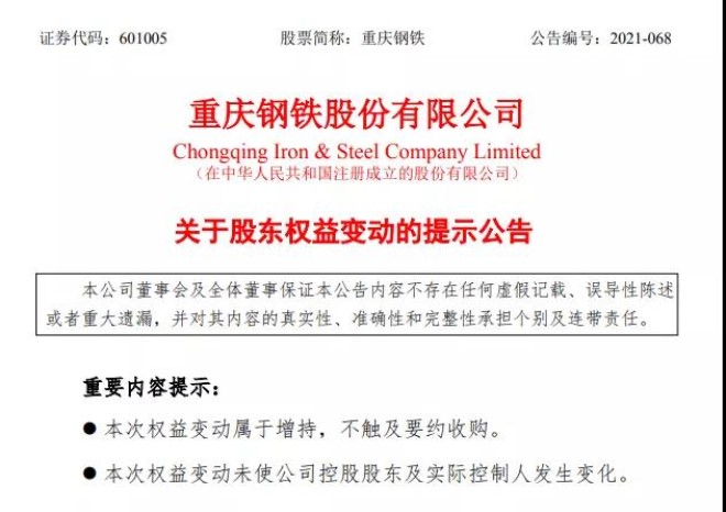 9月24日, 重慶鋼鐵(601005)公告,接實際控制人中國寶武鋼鐵集團有限公司(中國寶武)發來的《關于實際控制人權益變動的通知》,中國寶武于9月22日通過大宗交易方式,受讓重慶環亞建材有限公司(重慶環亞)持有的約1.30億A股,占公司總股本的1.46%,成交價格為2.62元/股,合計金額約3.406億元。